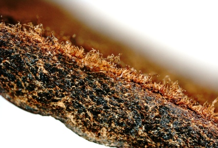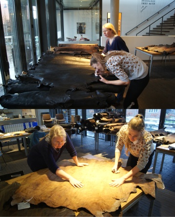 I follow the archaeologist into the cellar. Archeology departments apparently belong underground. It is surprisingly spacious and light there. In an office full of files, we talk about a recently excavated tannery in Enkhuizen. I am interested in the found tannin. That botanical material says something about the origin of a piece of leather and the local landscape. "Is that right?" Michiel asks a little too loudly and visibly enthusiastically. “Then I háve to show you something!” He jumps up, runs away and returns a moment later with a large roll of dark leather under his arm. He rolls out the stiff material over the linoleum, stands next to the skin and asks (a little out of breath), “Where did this come from?”