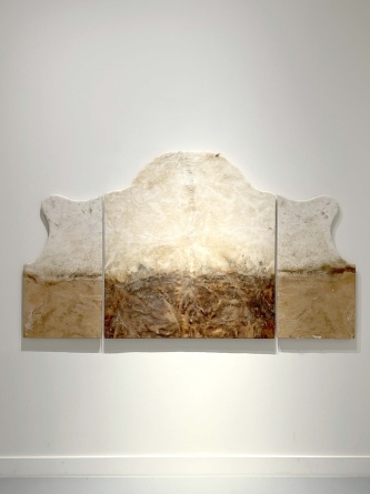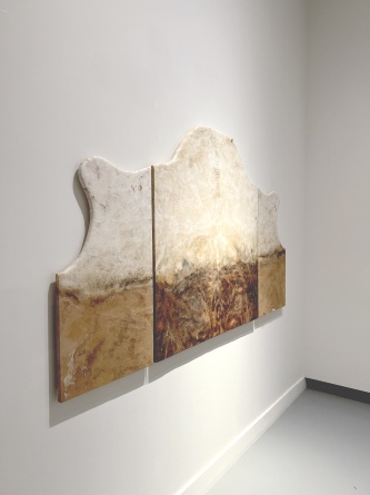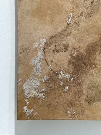 Where does the body end and the landscape begin? Amber Veel is fascinated by the skin. The boundary between being and environment. But how hard is that limit? In her work, Veel investigates the connection between the inner body and the outside world. To do this, she works with the material that forms that physical boundary: skin. She tan's leather using age-old techniques and with elements from the nearby natural environment. This work is tanned with seawater from Bergen aan Zee. By using different techniques and raw materials, she creates a landscape on the skin of an animal that was previously part of that same nature.