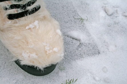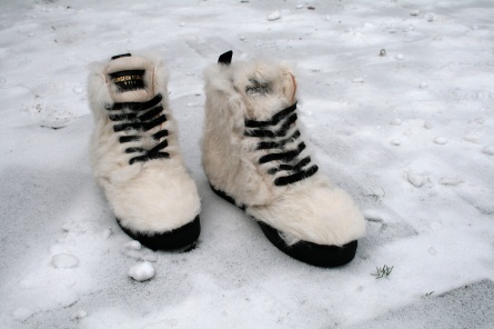 Material: locally harvested vegetable tanning material, rabbit skin, rubber sole, vegetable leather, glue, polyester yarn.