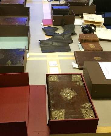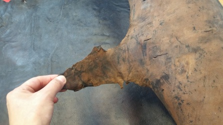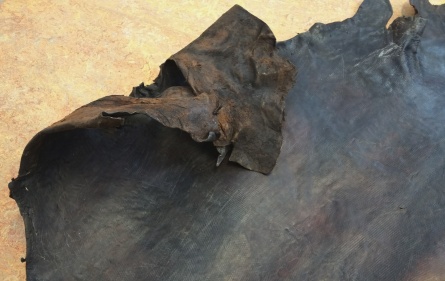 I follow the archaeologist into the cellar. Archeology departments apparently belong underground. It is surprisingly spacious and light there. In an office full of files, we talk about a recently excavated tannery in Enkhuizen. I am interested in the found tannin. That botanical material says something about the origin of a piece of leather and the local landscape. "Is that right?" Michiel asks a little too loudly and visibly enthusiastically. “Then I háve to show you something!” He jumps up, runs away and returns a moment later with a large roll of dark leather under his arm. He rolls out the stiff material over the linoleum, stands next to the skin and asks (a little out of breath), “Where did this come from?”