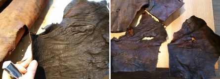 I kneel in front of the hide and gently run my hand over its surface. As soon as I sniff its scent, a mythical feeling comes over me. That deep dark red-brown color, the fine waffle pattern in the grain side (clearly applied by hand) and the spicy aroma of birch pitch: This is rare, ancient Russian leather or 'Cuir de Russie’!