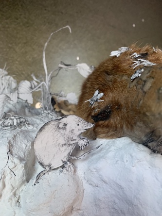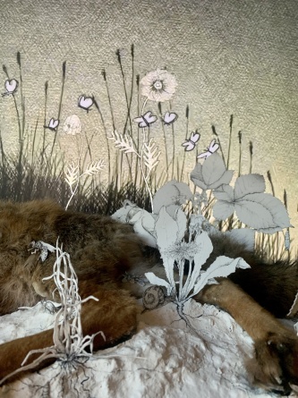 Under, on and around the fox it is teeming with life; small beetles, maggots, ants, butterflies. Larvae emerge. Birds and mice feast on the seeds and insects. In the earth it is very busy, insects and roots form a chaotic whole.
